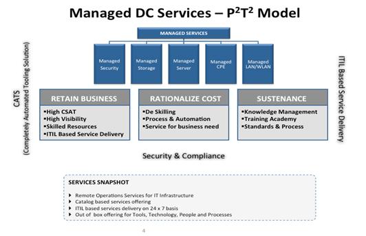 • ITIL alligned P2T2(People, Process, Tools andTechnology) framework with CATS (Completely Automated Tooling Solution) are alligned to deliver maximum value to our end customers.
